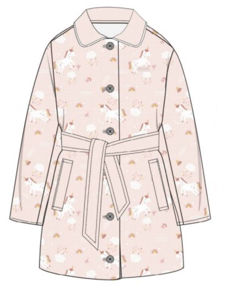 Bata niña confeccionada en tejido de coralina estampada de unicornios abotonada y cinturón.