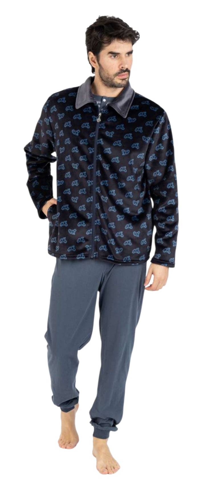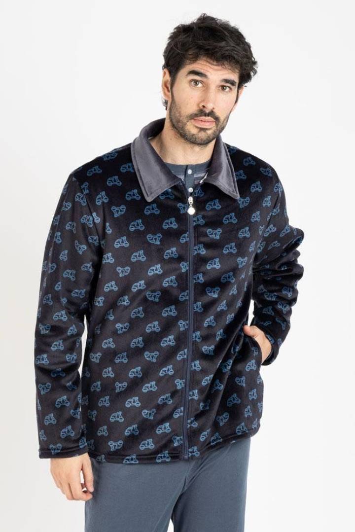 Bata corta micro coralina estampado de motos con cremallera y dos bolsillos laterales, en un tejido extra suave y calentito.