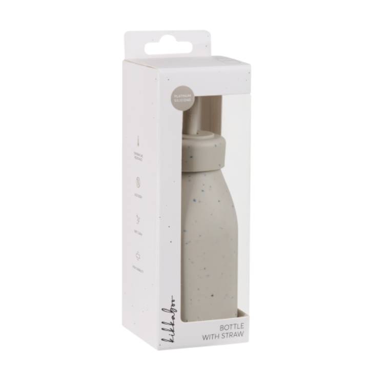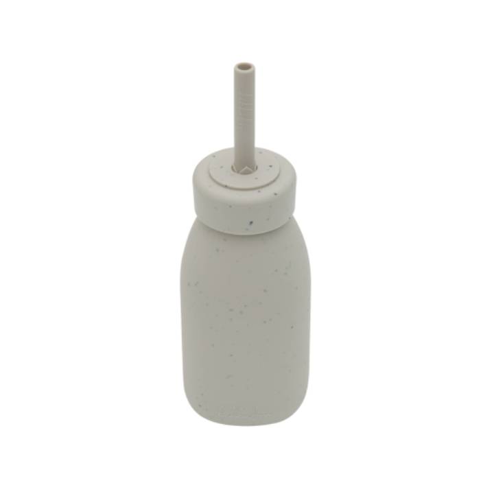 Biberón con pajita en silicona platino que fomenta la independencia a la hora de beber, se puede apretar suavemente para introducir el líquido en la pajita. Sin BPA