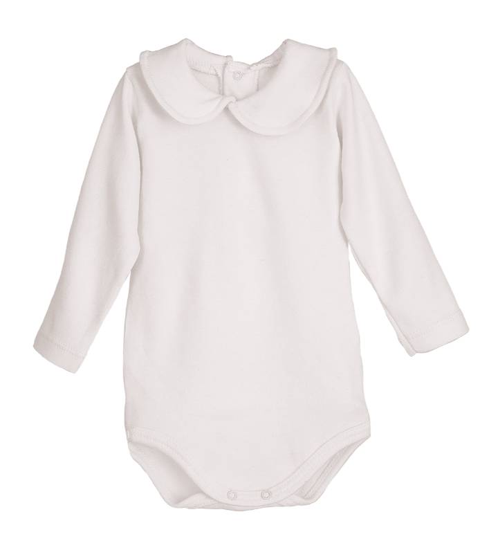 Body camiseta en manga larga con cuello camisa, abertura en espalda y entrepierna con broches automáticos.