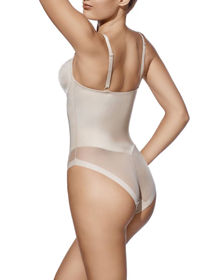 Body con aros y copa de relleno en B/C. Espalda totalmente escotada y trasero de tul con corte láser.