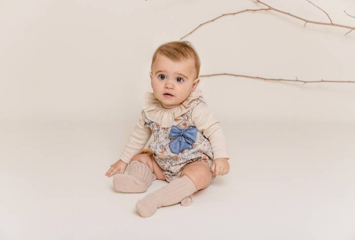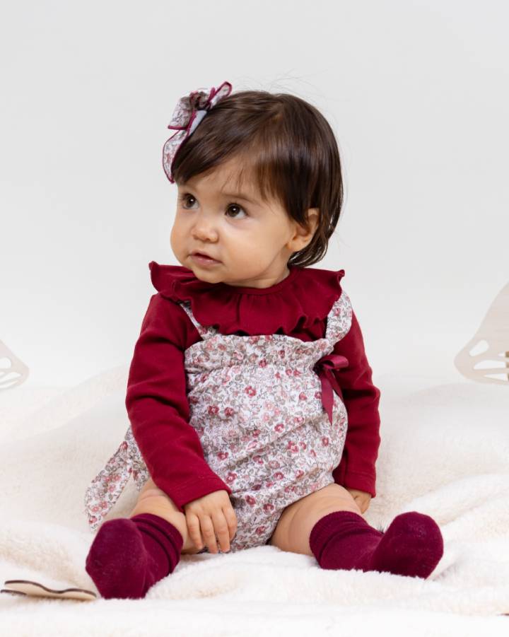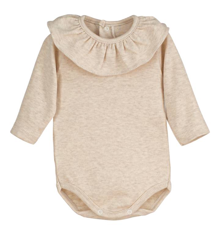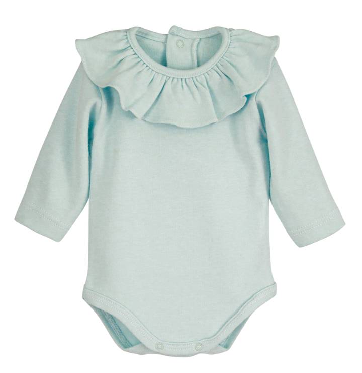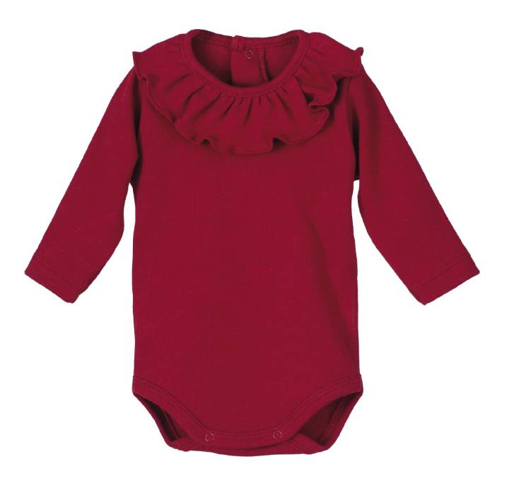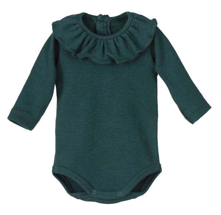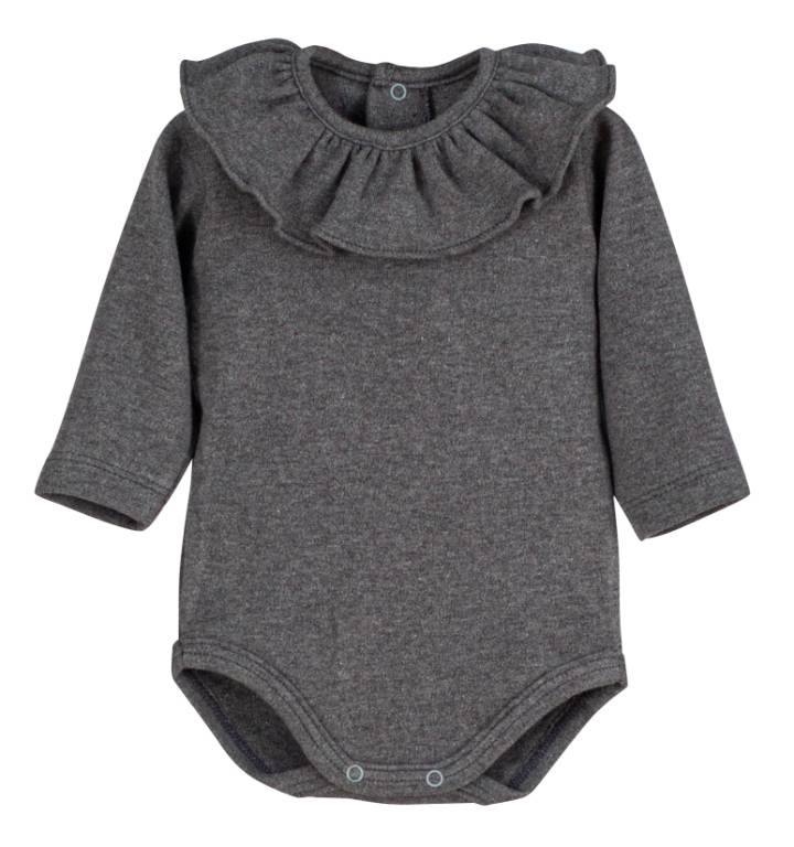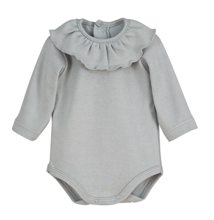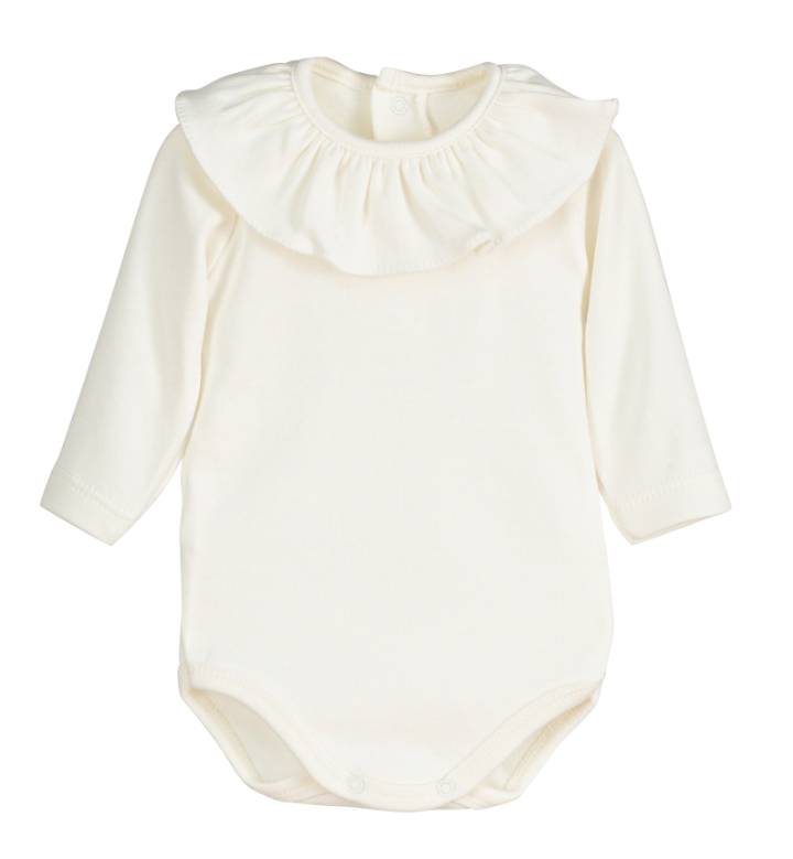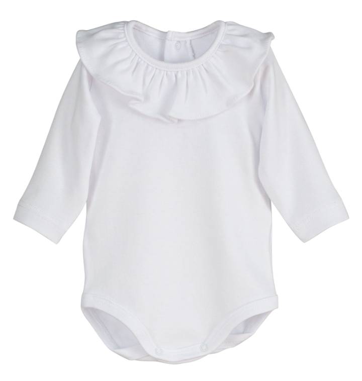 Body camiseta en manga larga con generoso volante en cuello, abotonada en espalda y entrepierna.