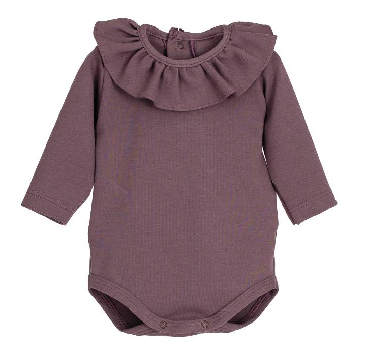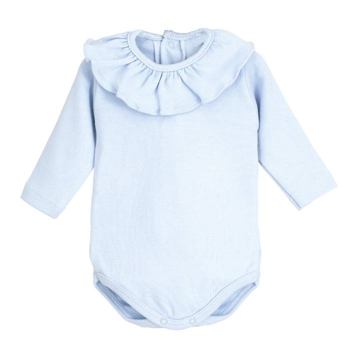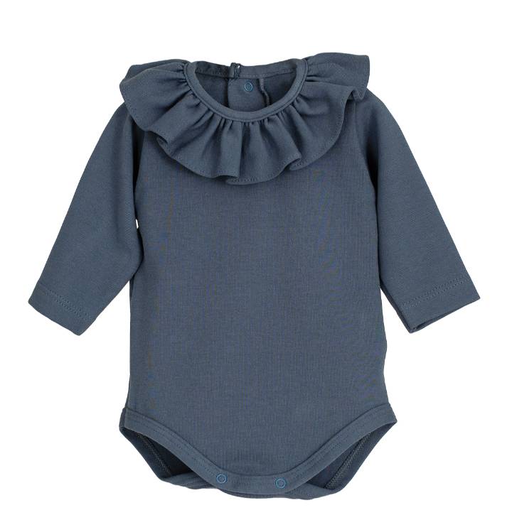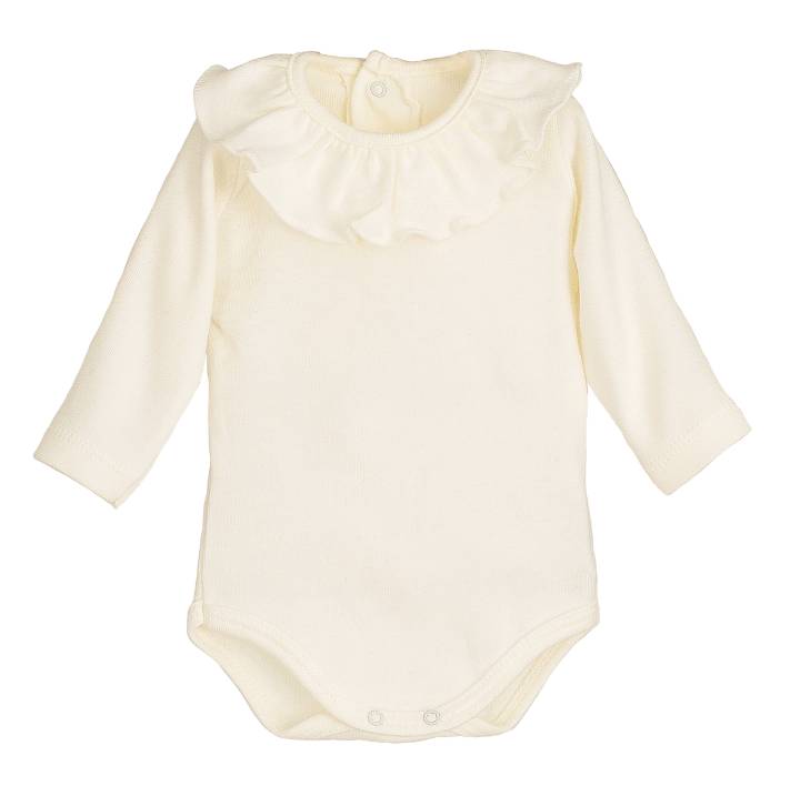 Body camiseta en manga larga con generoso volante en cuello, abertura en espalda y entrepierna con broches automáticos.
