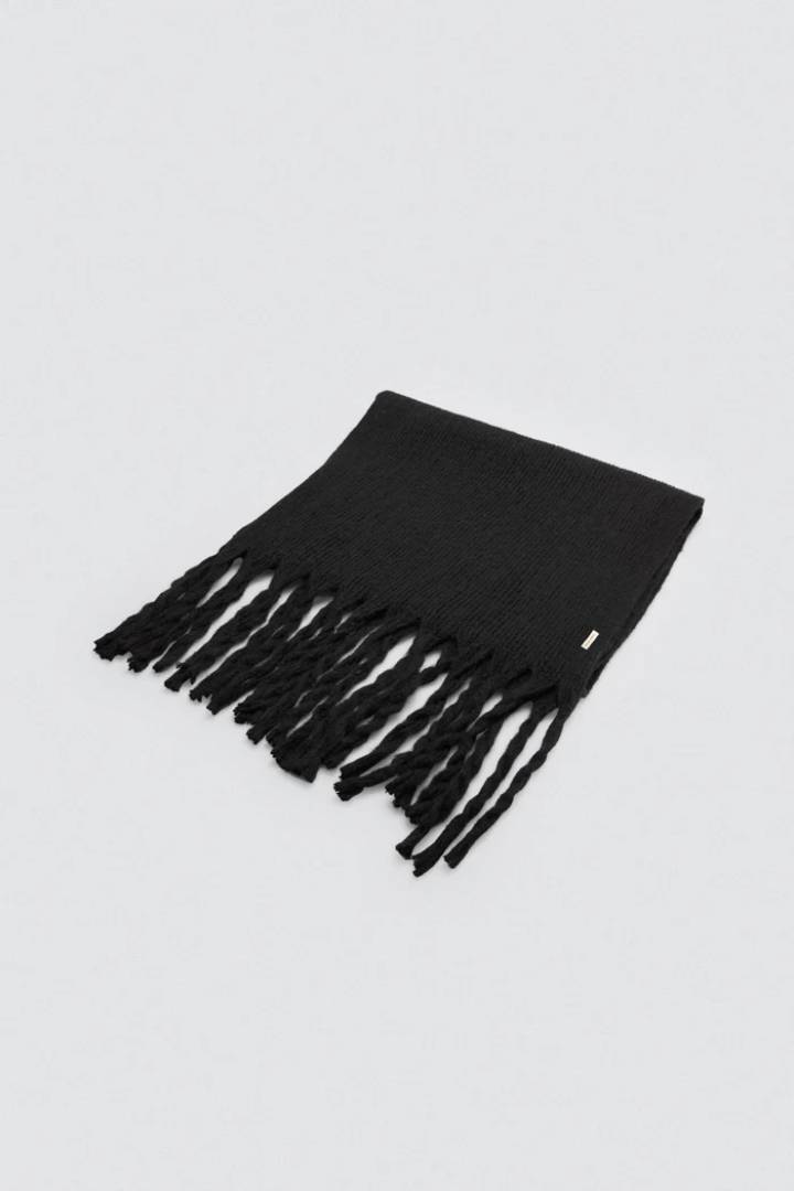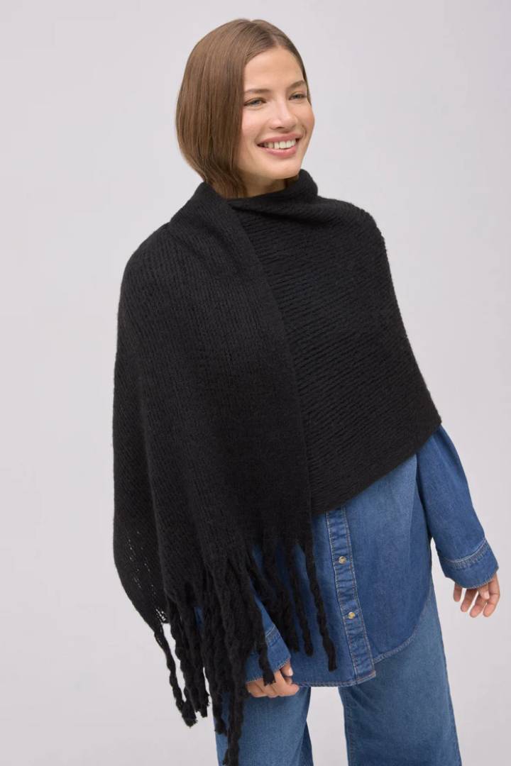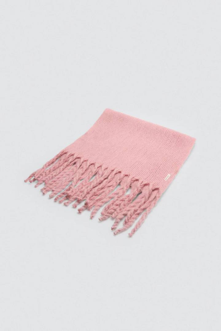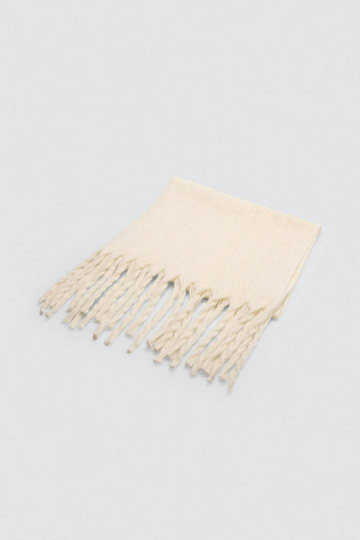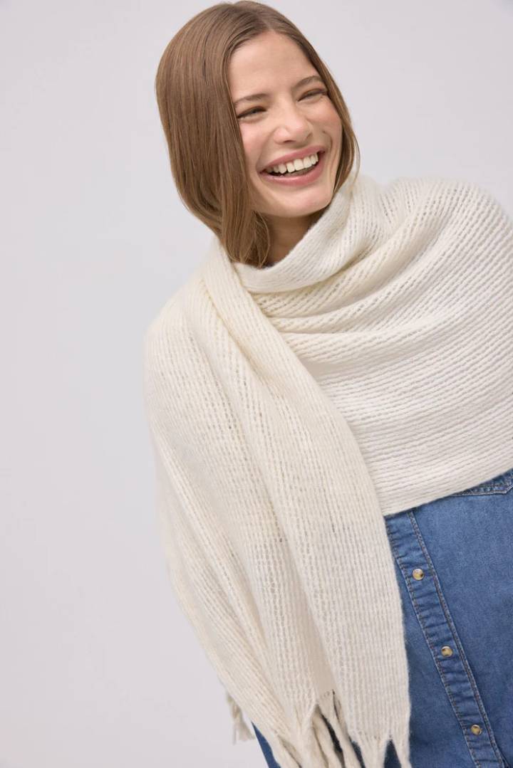 Bufanda lisa tipo pashmina con textura suave y flecos.