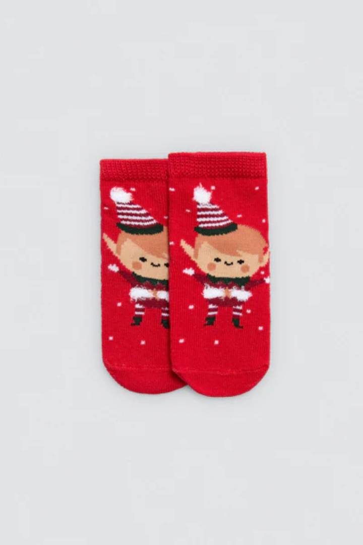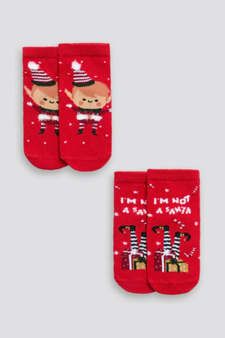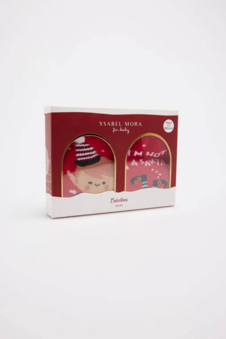 Calcetines bebé navidad pack 2 unidades. Estos adorables diseños navideños de elfos adorables sobre fondo rojo son perfectos para que los más pequeños. Puño anti presión para un ajuste cómodo sin apretar. Tejido suave con algodón. Pack regalo en una caja especial Navidad.