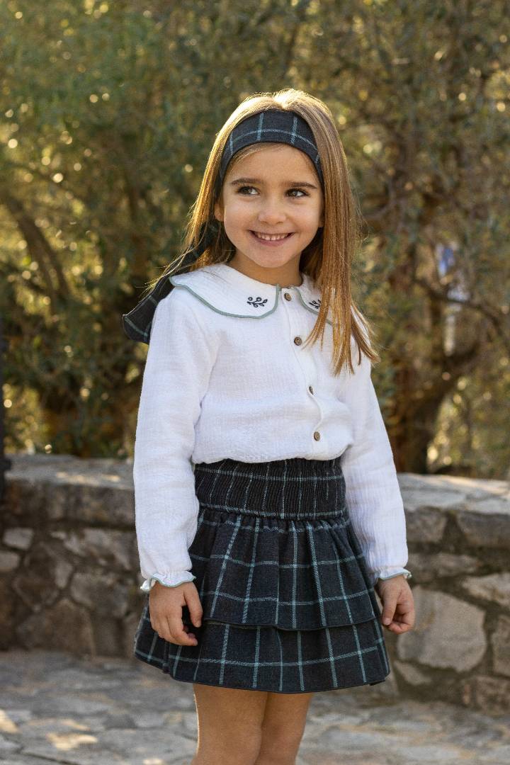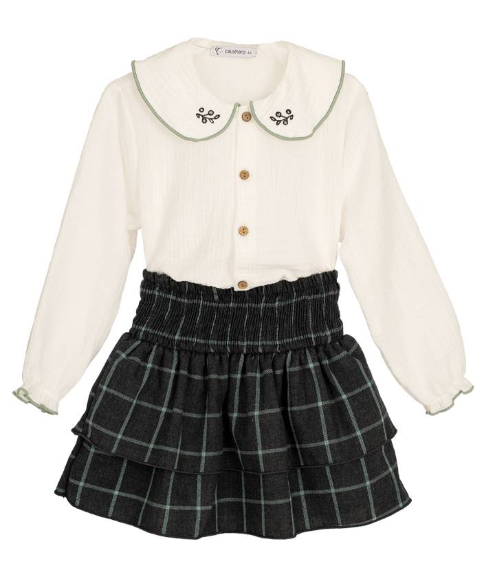 Conjunto falda compuesto por camisa con volante bordado en cuello y manga con puños ligeramente fruncidos. Falda de cuadros con volantes y frunce ancho en cintura.