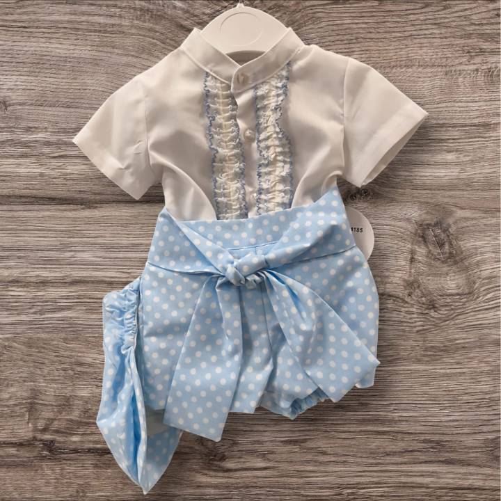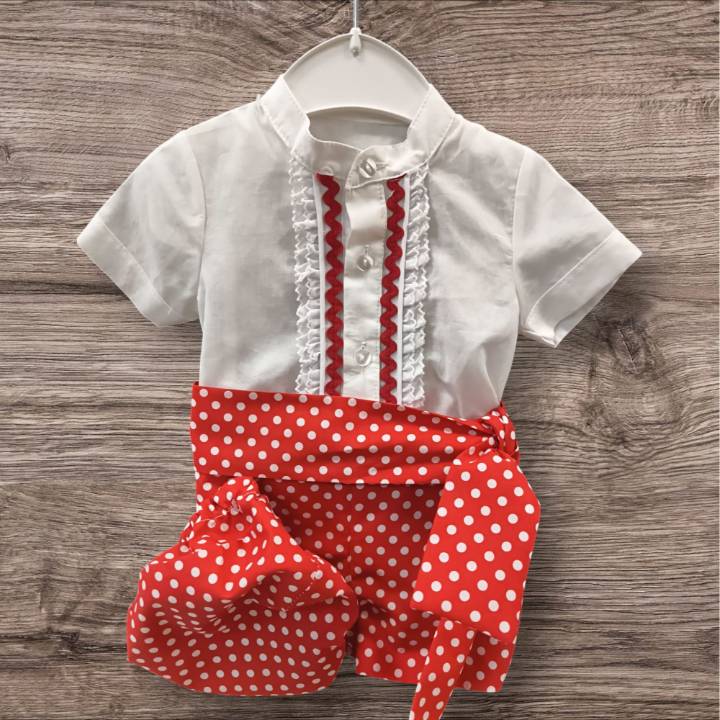 Conjunto flamenco de niño compuesto por camisa de manga corta con chorreras a juego con el pantalón, al igual que la gorra, cinturón y pantalón de lunares.