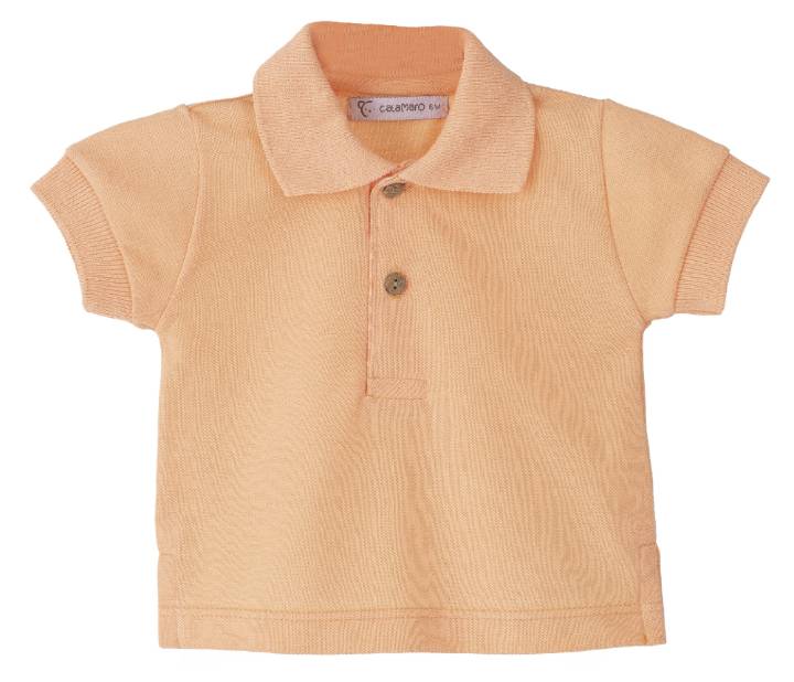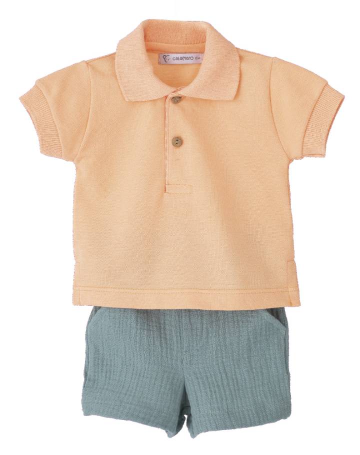 Conjunto Pantalón Subiyan compuesto por dos piezas. Camiseta polo de manga corta naranja. Pantalón de bambula en color verde menta.