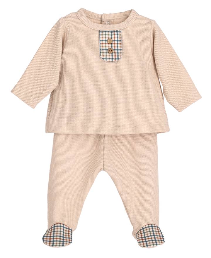 Confeccionado con tejido suave y transpirable, este conjunto está compuesto por una camiseta de manga larga con cuello estilo bebé y una polaina a juego ambas en color arena, cuidando cada detalle para el bienestar del recién nacido.