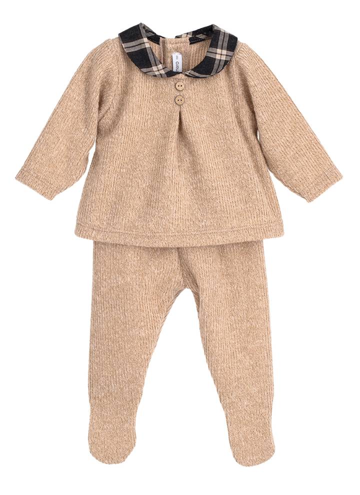 Conjunto polaina para recién nacido, compuesto por camiseta arena con cuello camisa de tela estampada a cuadros y dos botones decorativos. Polaina lisa en arena.