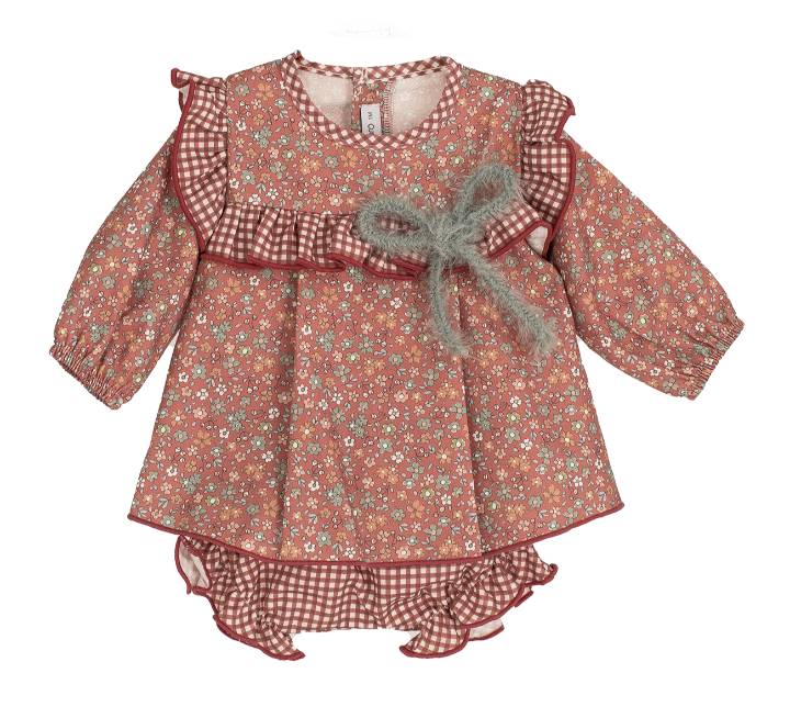 Jesusito en color terracota con estampado de flores, cuello de volantes y un lazo de pelo decorativo. Braguita a juego.