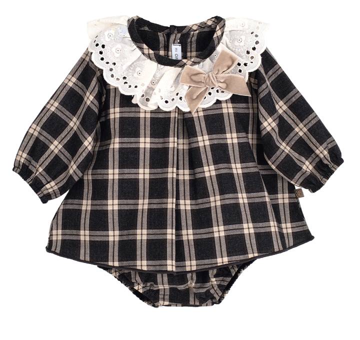 Jesusito estampado a cuadros con volante bordado en cuello y adorno con lazo de terciopelo, manga con puños ligeramente fruncidos. Braguita en mismo estampado.
