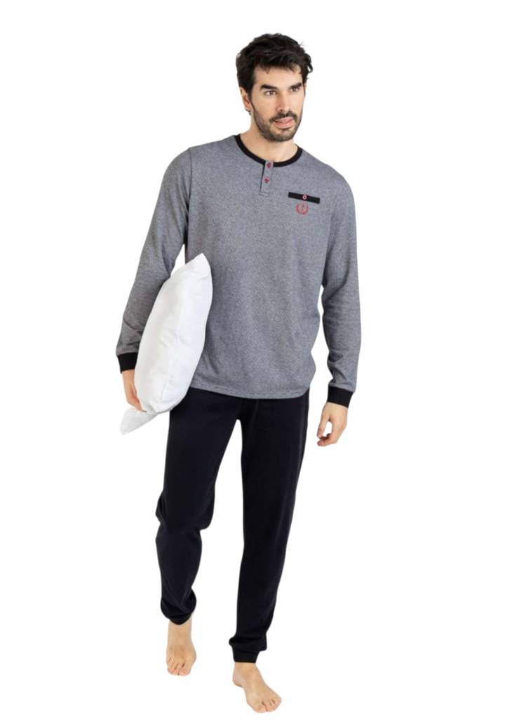 Pijama hombre algodón, camiseta lisa con botones en el cuello para mayor comodidad, un pequeño bolsillo y puños. Pantalón liso con puños.