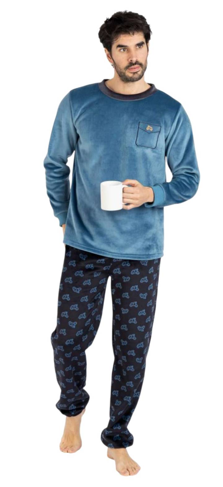 Pijama de hombre en tejido de micro coralina suave y comodo a la vez que te aporta calor para los días fríos del invierno , lleva una camiseta en color azulón con cuello redondo y puños. Pantalón estampado de motos en azul marino con puños.