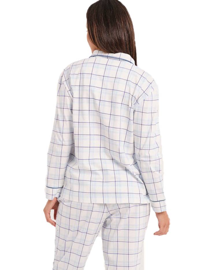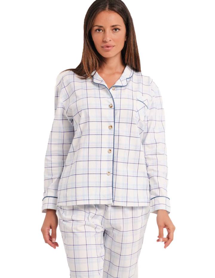 Pijama para mujer de algodón de la marca Don Algodón con camiseta de manga larga y abierto con botones. Pantalón largo con cordón en la cintura. Elegante estampado de cuadros.
