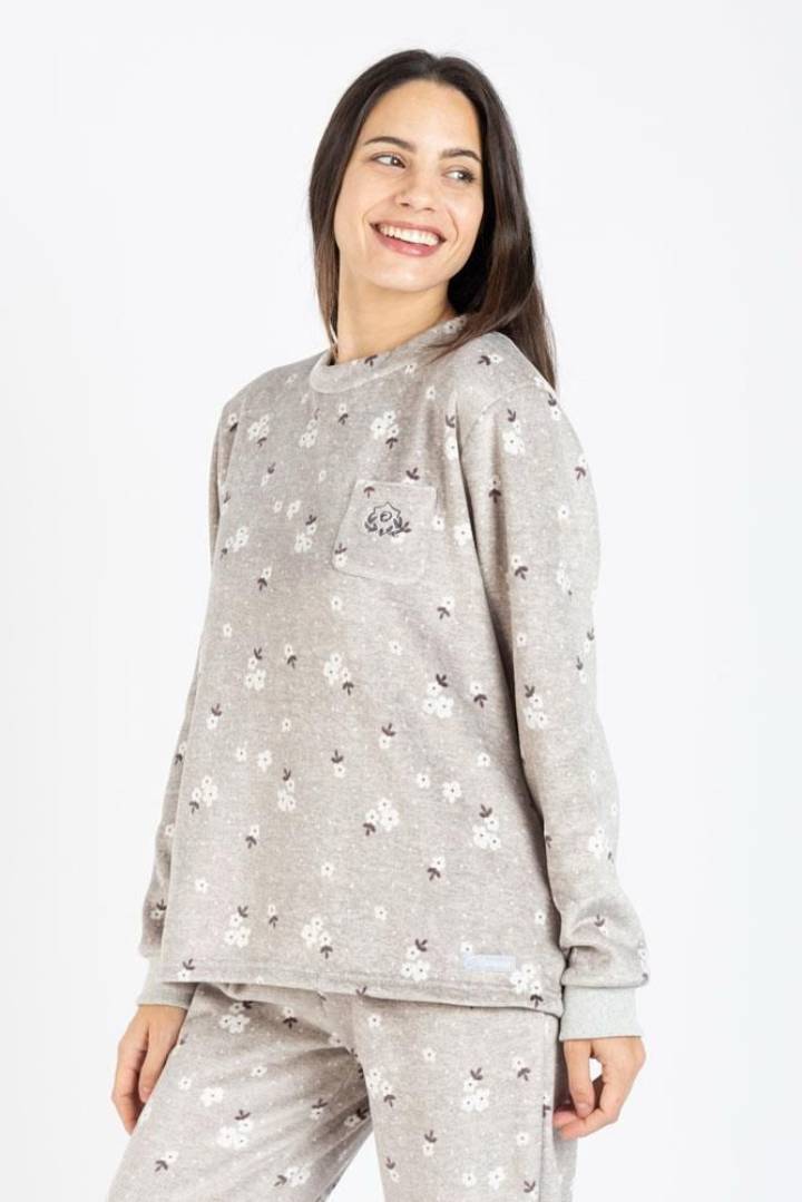 Pijama mujer elaborado en suave coralina. Compuesto una camiseta gris estampada con flores blancas y un pantalón gris estampado como la camiseta ajustable en la cintura. Acabado en puño ambas piezas.