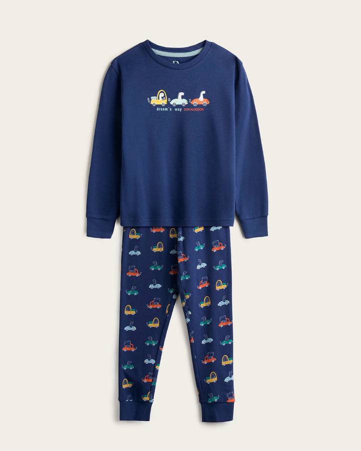 Haz que la hora de dormir sea una aventura con este pijama de algodón para niño, lleno de divertidos estampados de animales.