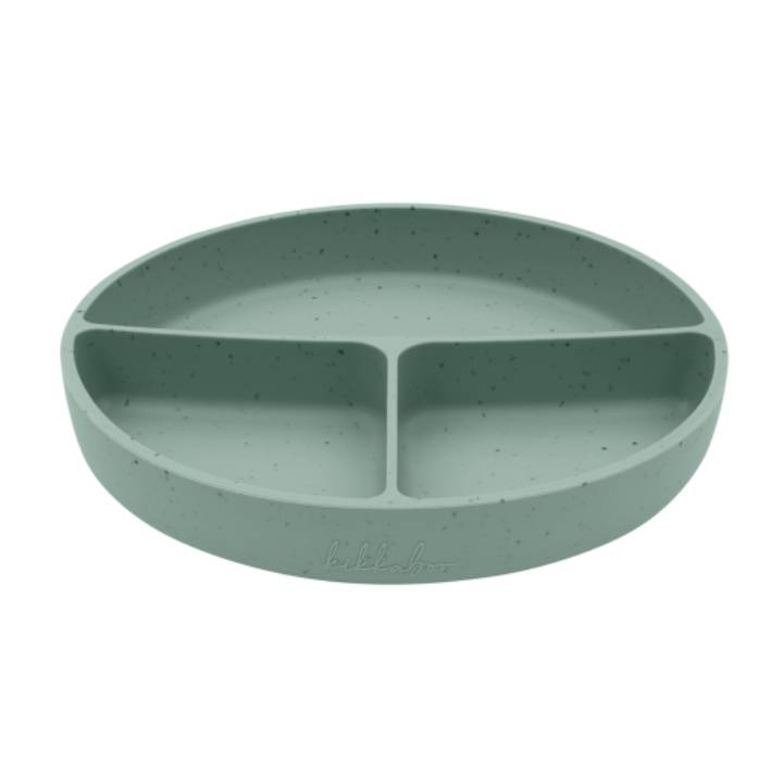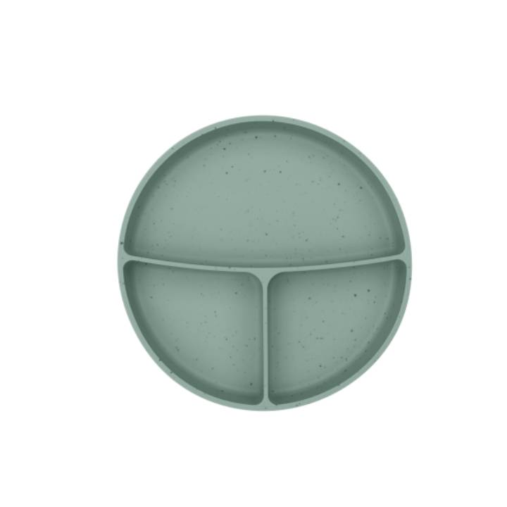 Plato de silicona dividido en tres departamentos con base de succión para evitar el desplazamiento del plato y facilitar la alimentación del peque. Sin BPA.