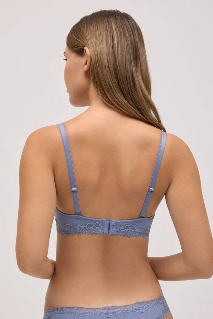 Sujetador con aro con relleno de tejido Jacquard texturizado. Detalles de encaje. Delicado y elegante. Disponible en copas C. Color azul.