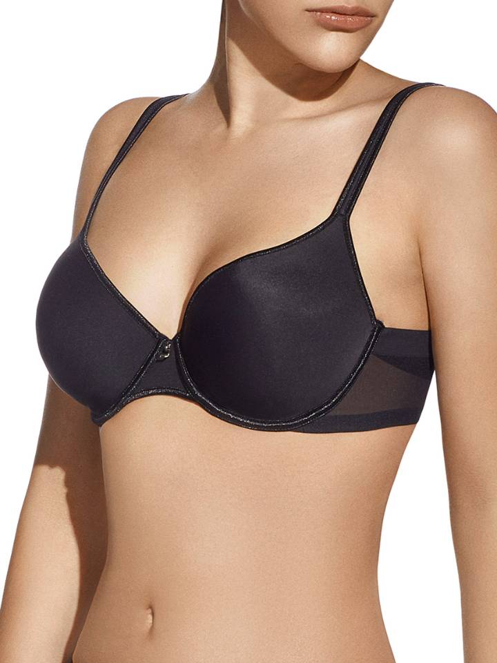 Sujetador con aros y copa de relleno, fabricado en microfibra. Elegante y cómodo cruce de tules en la espalda. Ideal para minimizar imperfecciones.
