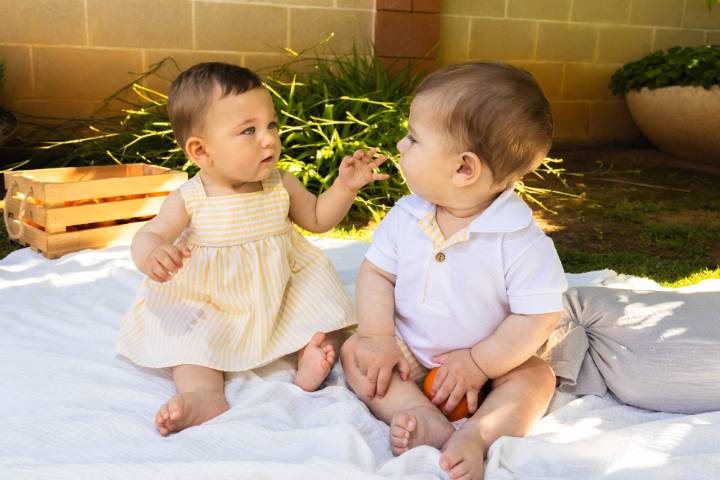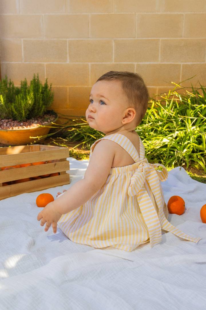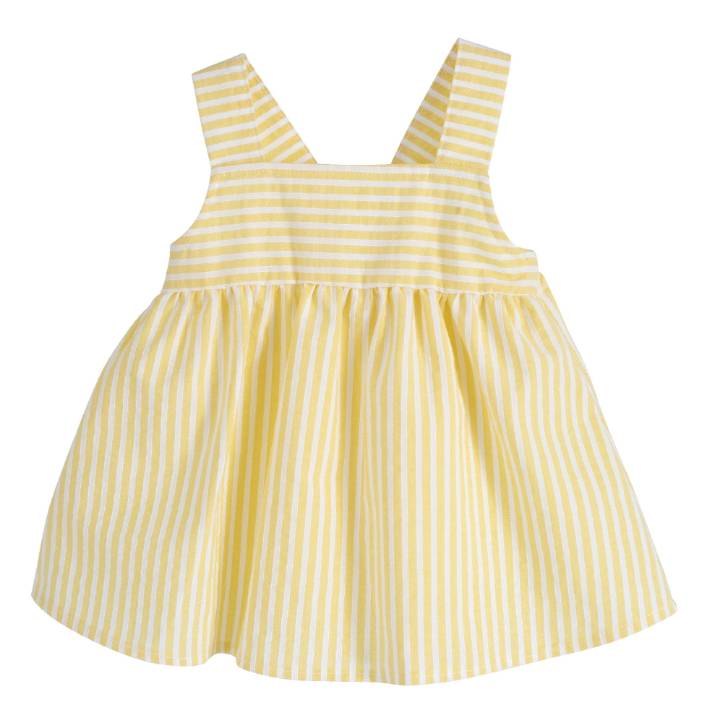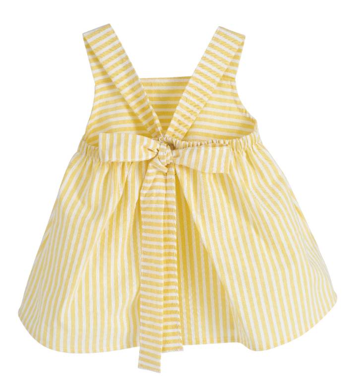 Vestido Frisa amarillo con rayas blancas de tirantes con un lazo en la parte trasera (los tirantes son regulables con el lazo trasero)