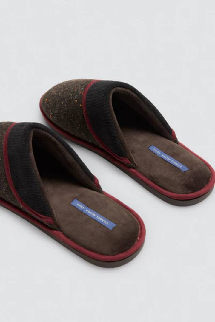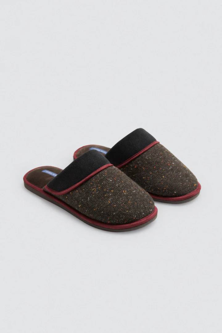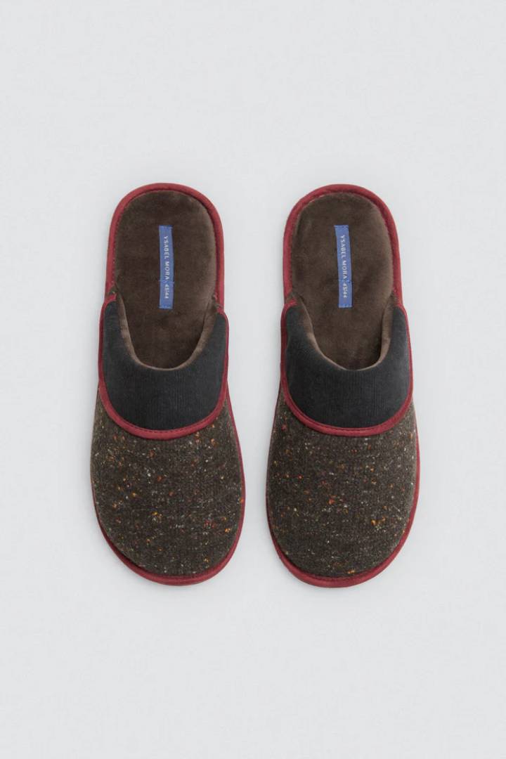 Zapatillas de casa están confeccionadas en un suave tejido jaspeado de tonos oscuros que aporta un estilo único, combinados con detalles en color burdeos que le dan un contraste moderno y elegante. El ribete de acabado suave que añade un toque elegante  y la estructura resistente garantizan comodidad en cada paso. Un diseño que fusiona lo casual con un toque sofisticado, ideal para tu descanso en casa. Suela cómoda, ideal para el uso en interiores. Diseño casual y sofisticado para un look relajado en casa.